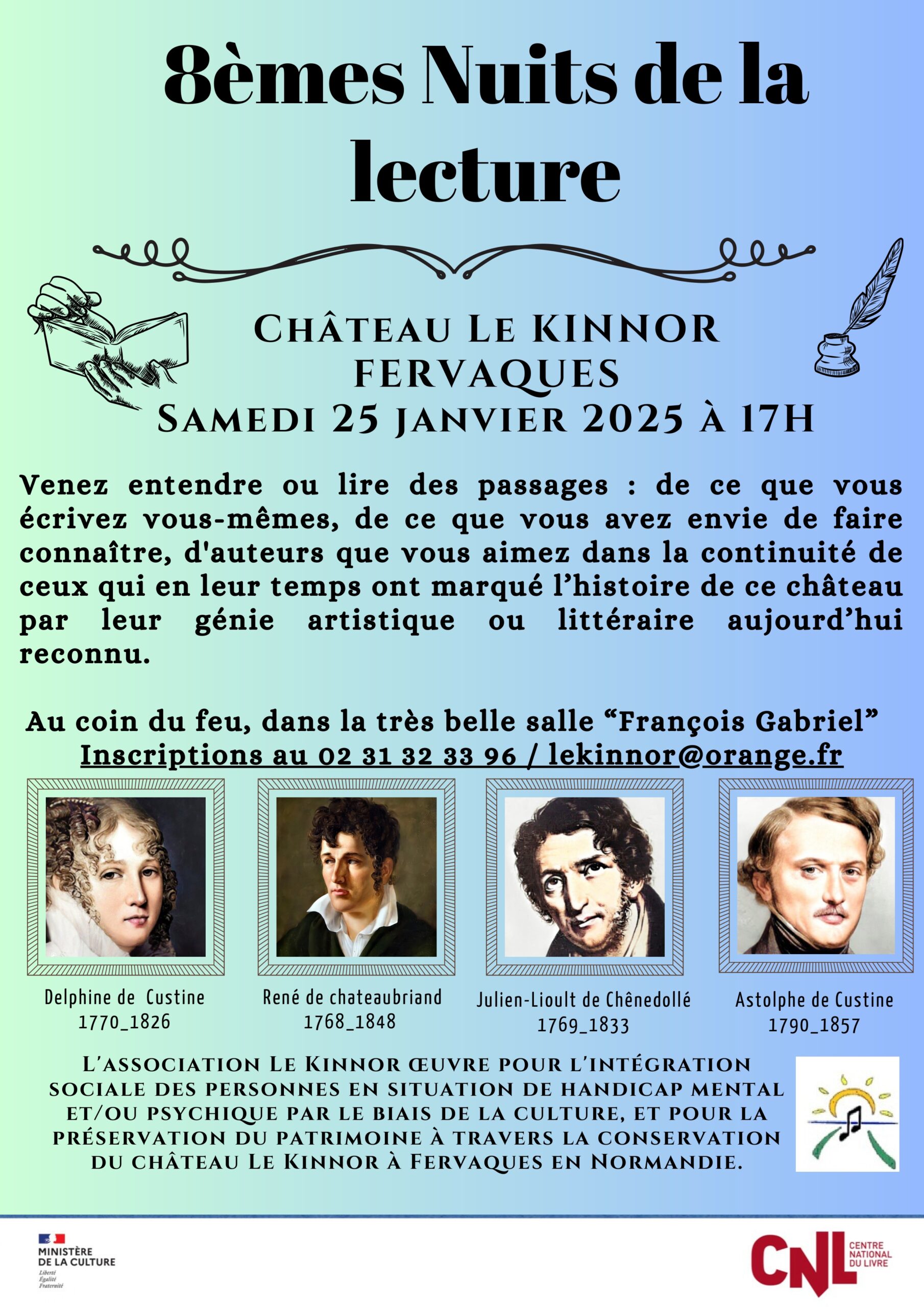 Le Samedi 25 Janvier à 17h, dans la salle François Gabriel du Château le KINNOR, dans la mouvance de CHATEAUBRIAND qui a écrit ici au Château le KINNOR, perpétue la grandeur du Lire et de l'Ecriture. Toute personne peut s'inscrire pour lire un passage d'une oeuvre qu'elle désire faire connaître ou un passage d'une oeuvre qu'elle a écrite elle-même.